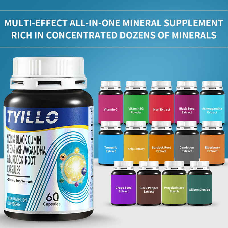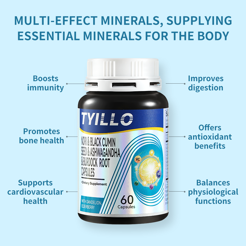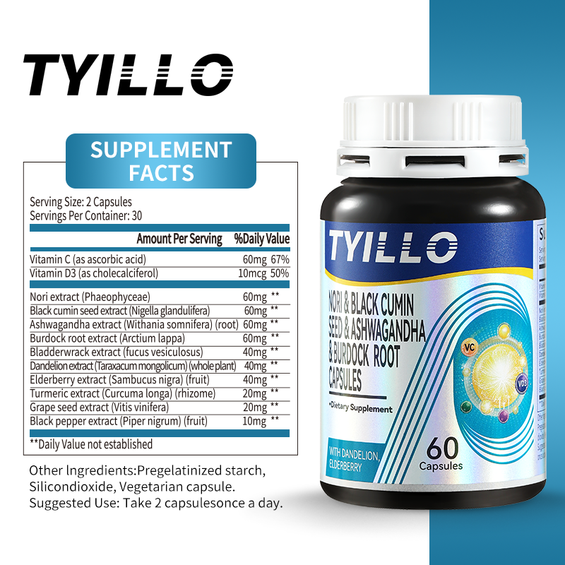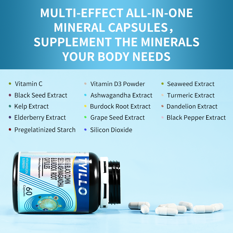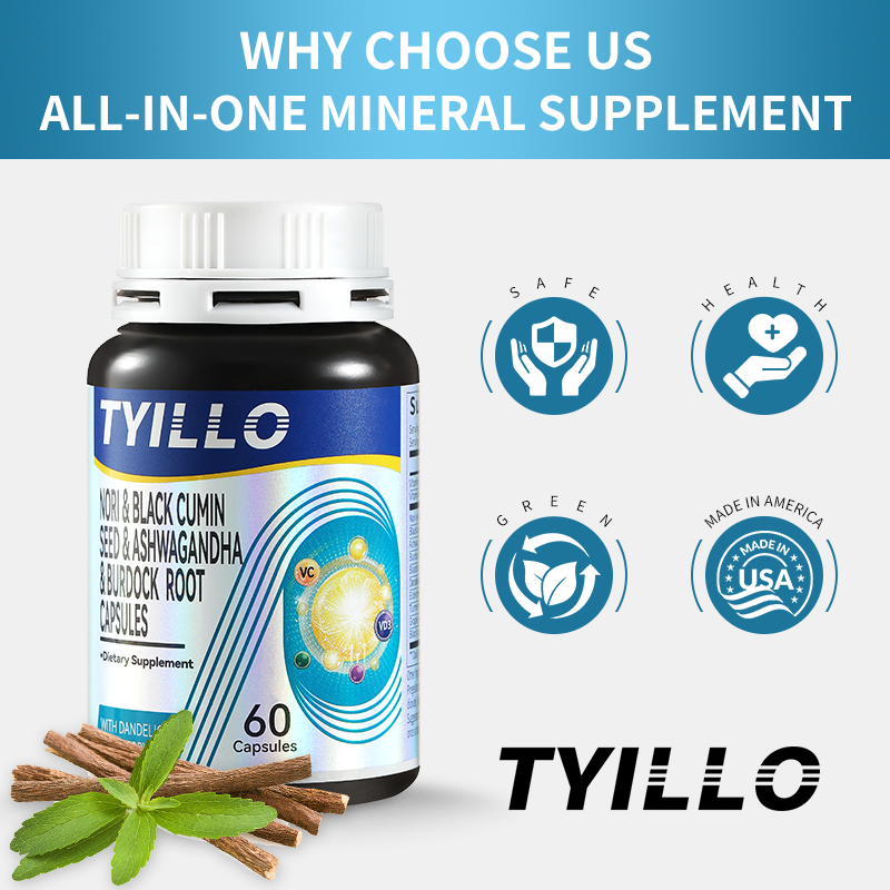 • Tyillo Seamoss Black Seed Ashwagandha Burdock Root Capsules, 15-in-1 Multivitamin and Mineral Supplement, Boosts Male Energy, Enhances Immunity, Comprehensive Nutritional Supplement, Made in the USA, 60 Capsules.
